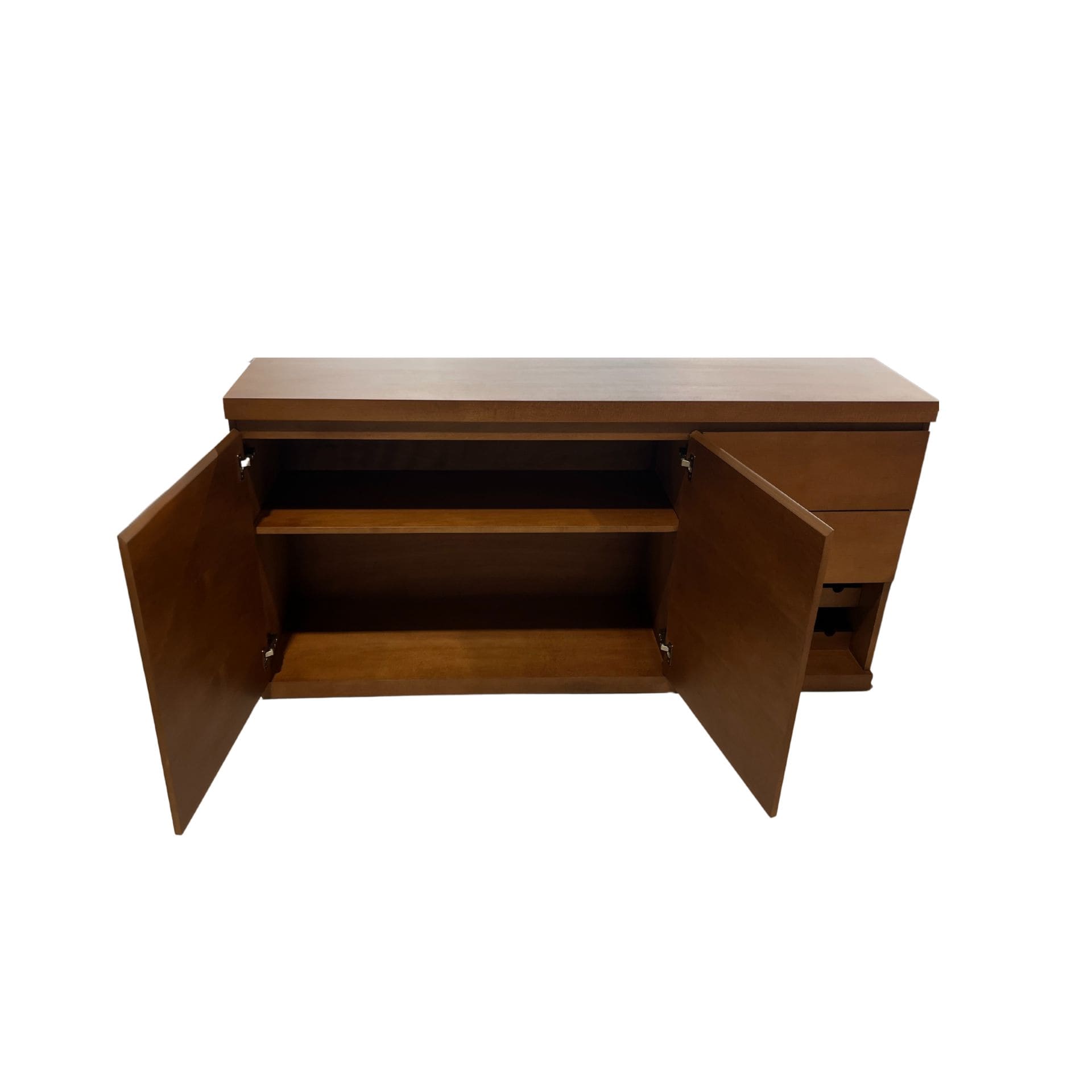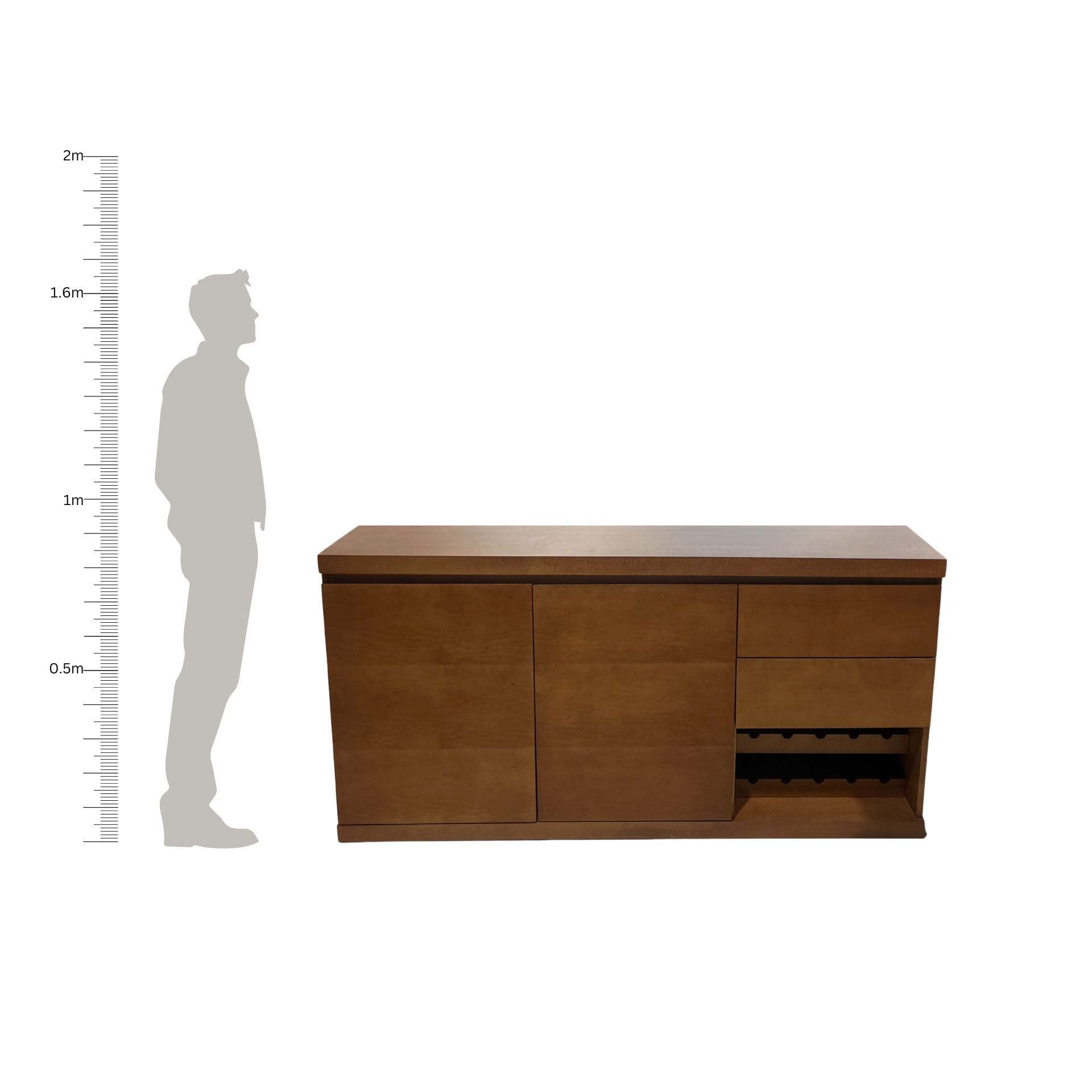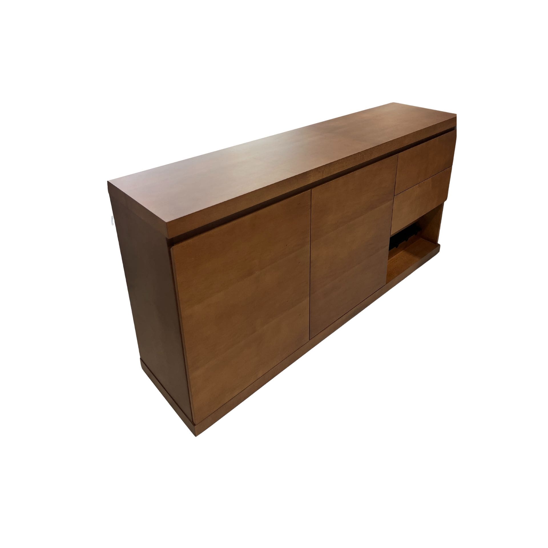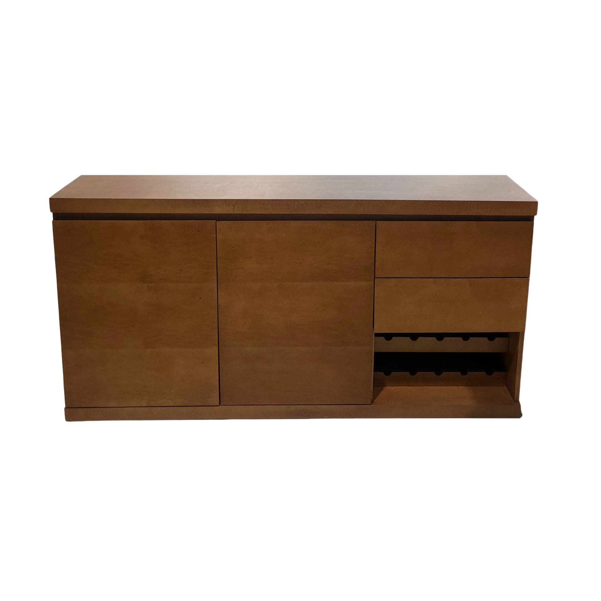 Credenza con amplio espacio de guardado y compartimiento para botellas. Su diseño práctico y acabado en tono madera la hacen ideal para comedor o estancia