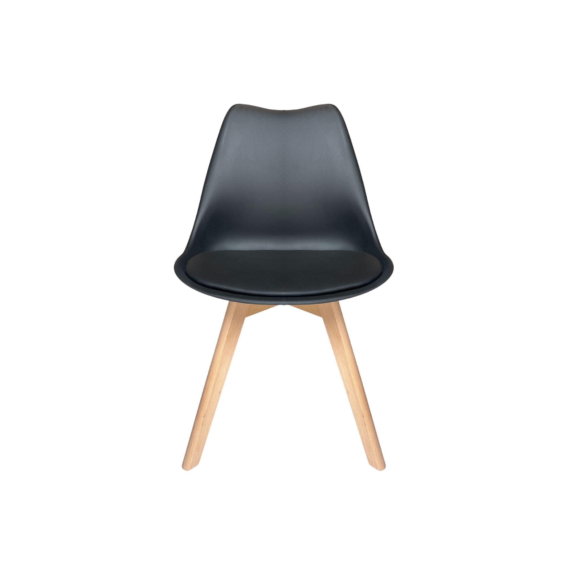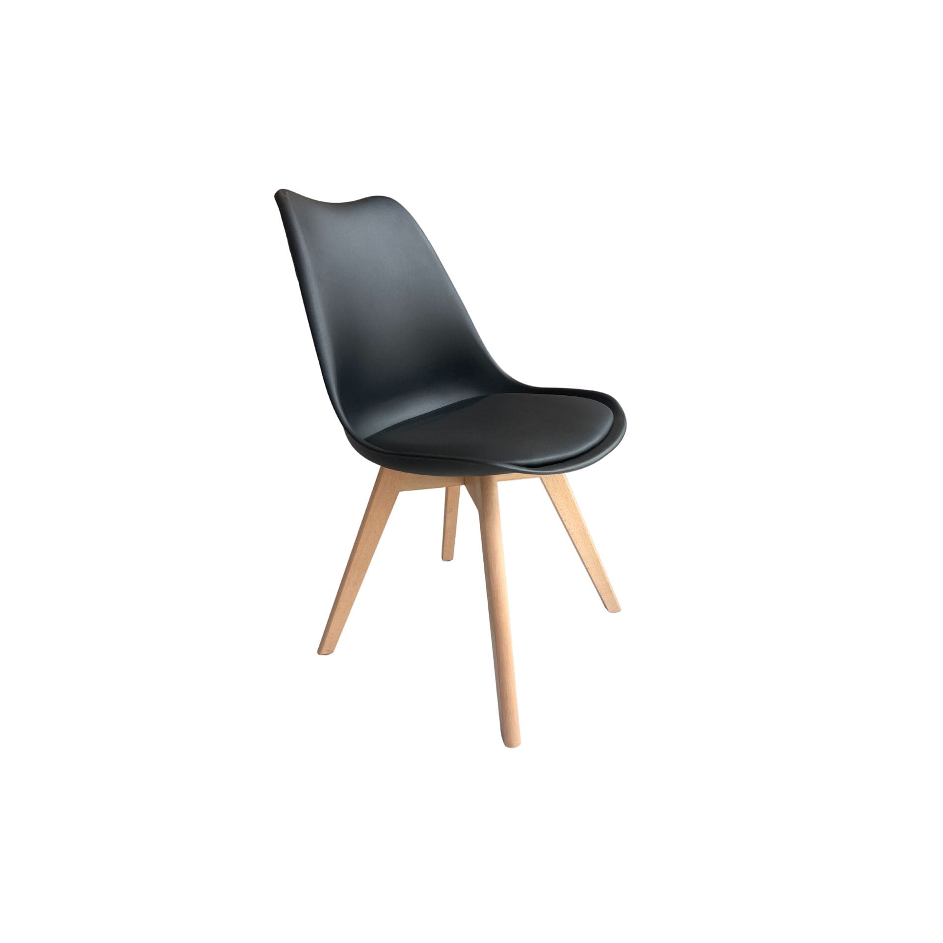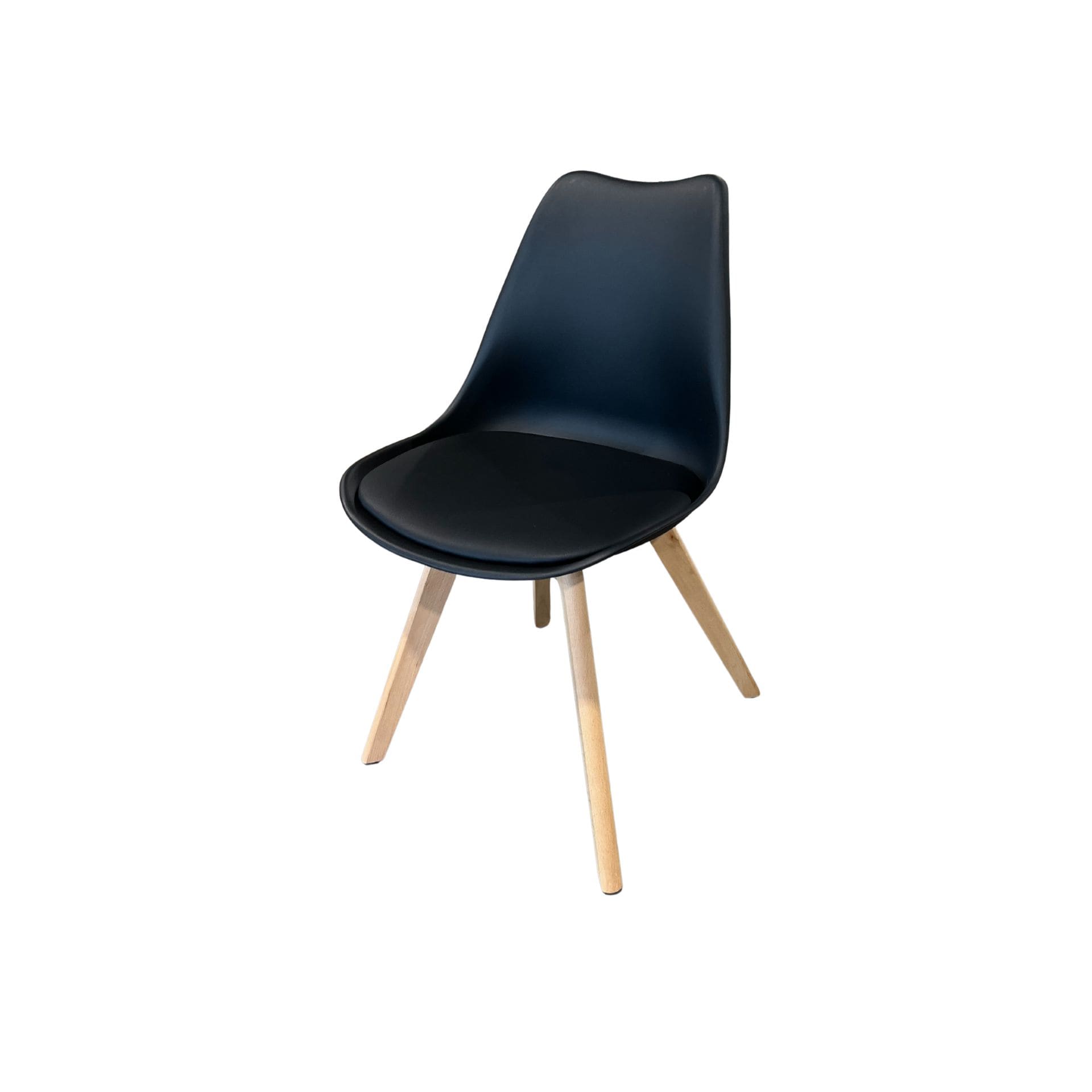 Silla estilo Eames en color negro, fabricada en plástico resistente y equipada con asiento de vinipiel para mayor comodidad. Su diseño moderno y versátil la hace perfecta para comedores, oficinas o espacios contemporáneos.